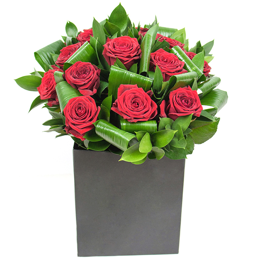Immerse yourself in the exquisite charm of our red roses bouquet, featuring rich red blooms, glossy aspidistra leaves, and graceful ruscus. This unique design brings refinement and grace to any home or event.