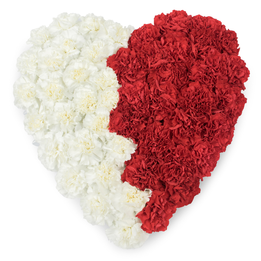 Step into a world of elegance with our beautifully arranged bouquet that melds the purity of white carnations with the vibrancy of red, forming a distinctive heart shape. Every carnation is hand-selected at its best, ensuring each bloom enhances this luxurious display with vitality and freshness.